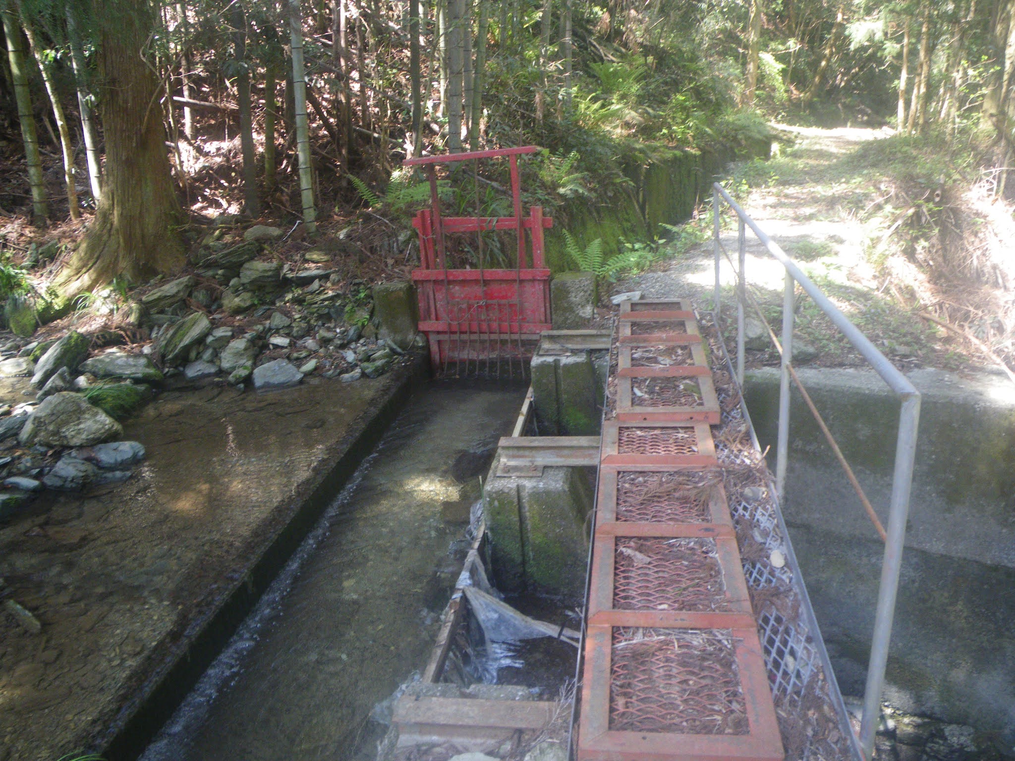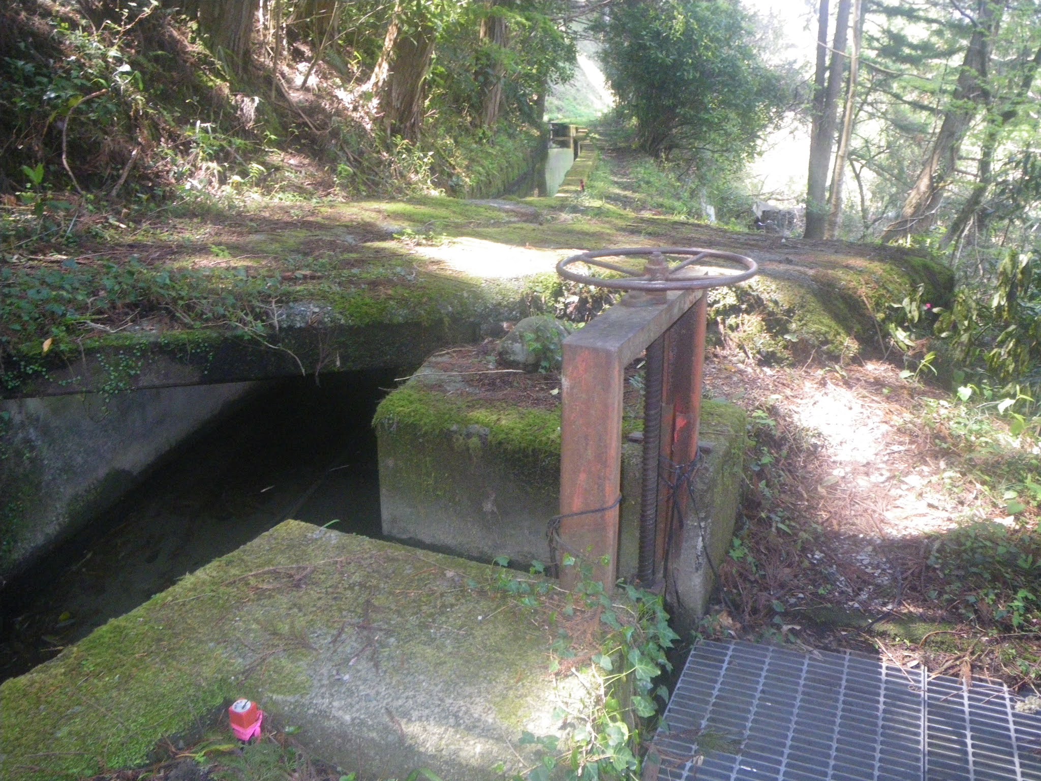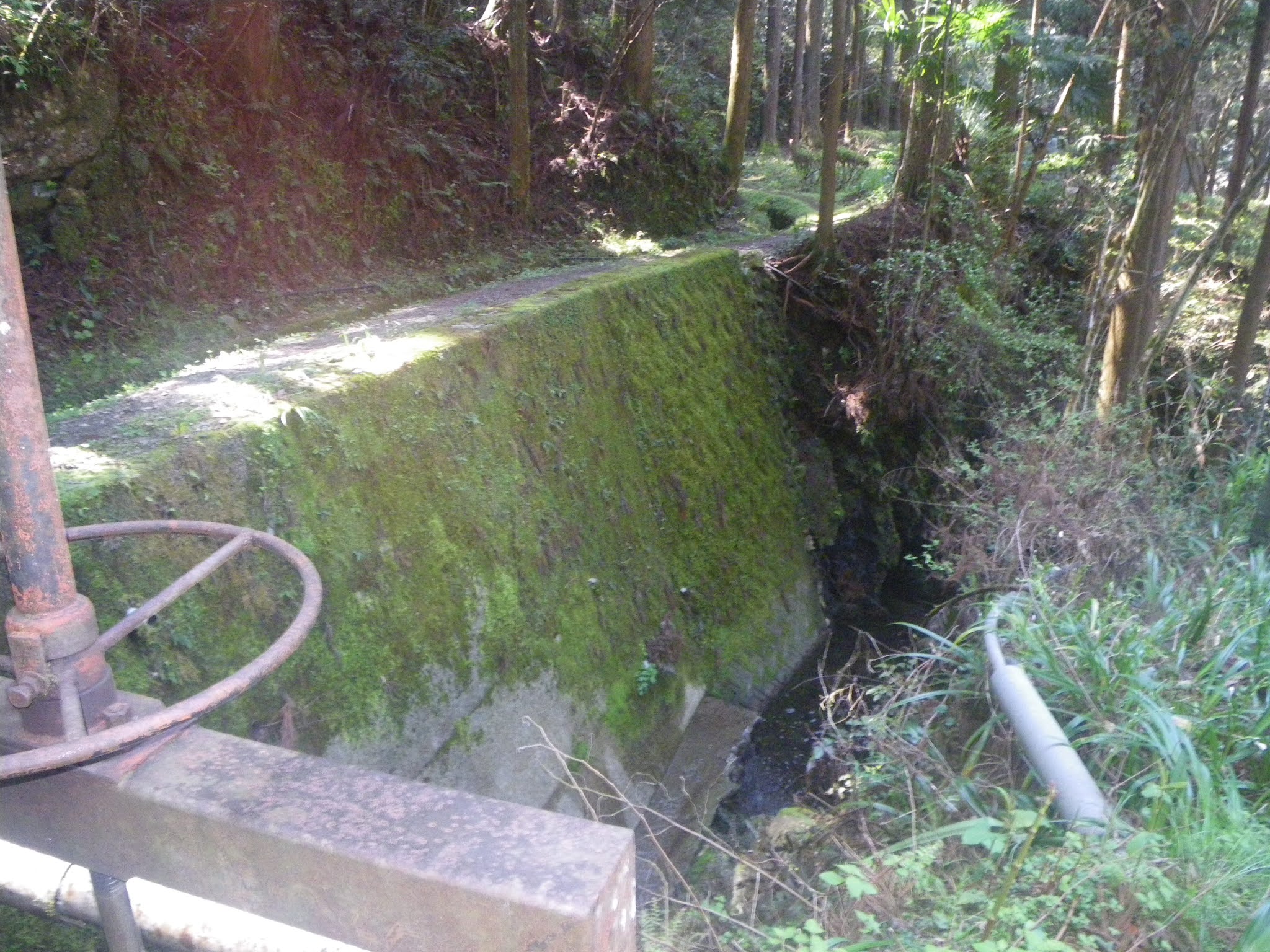 18分ほど歩き、おおよそその比高差が20mほどのギャップとなったところで最初の沢とクロスする。水路には簡易水門が設けられている。下は直ぐ川であり時に応じ水を川に放流するのだろう。