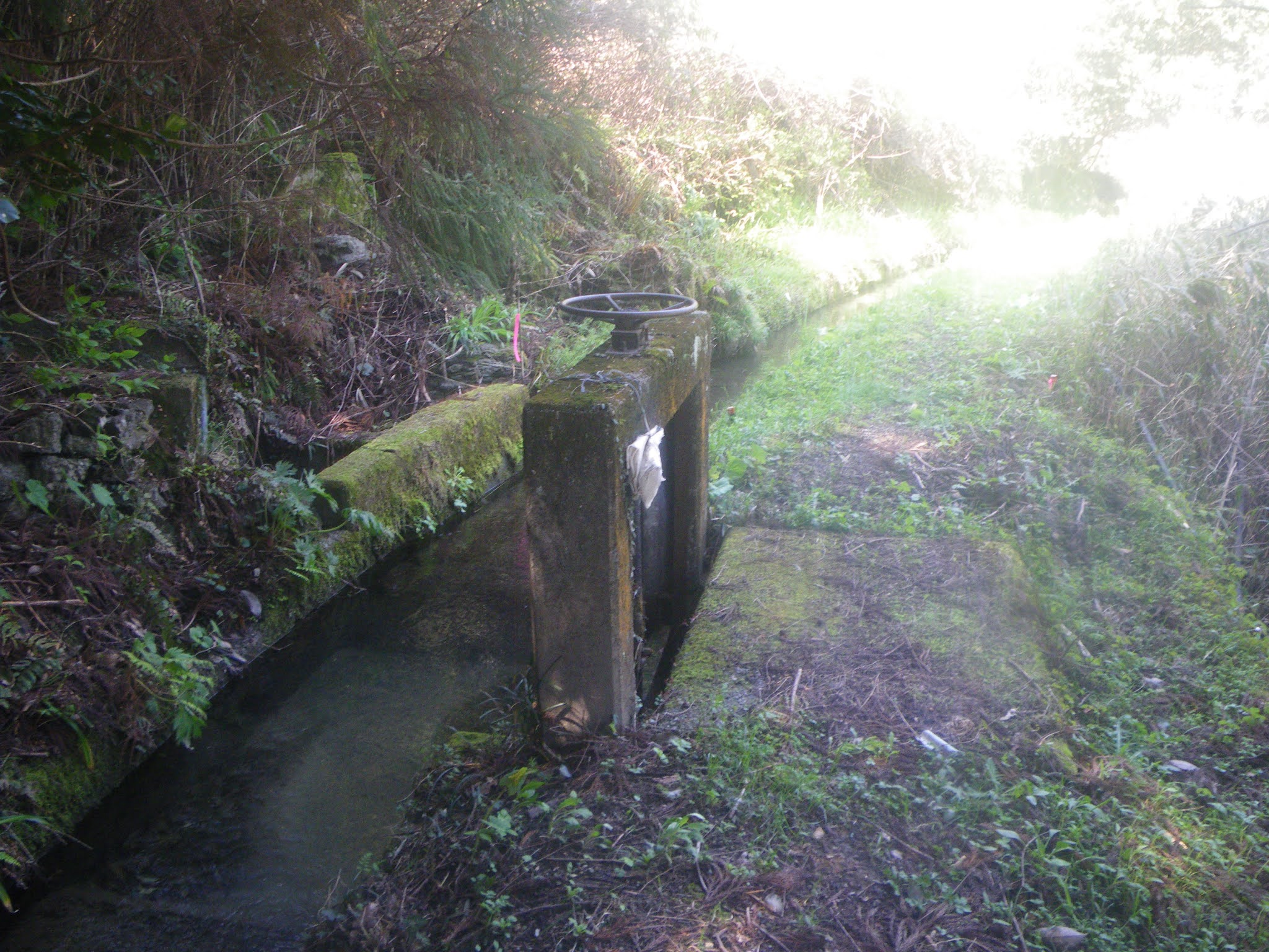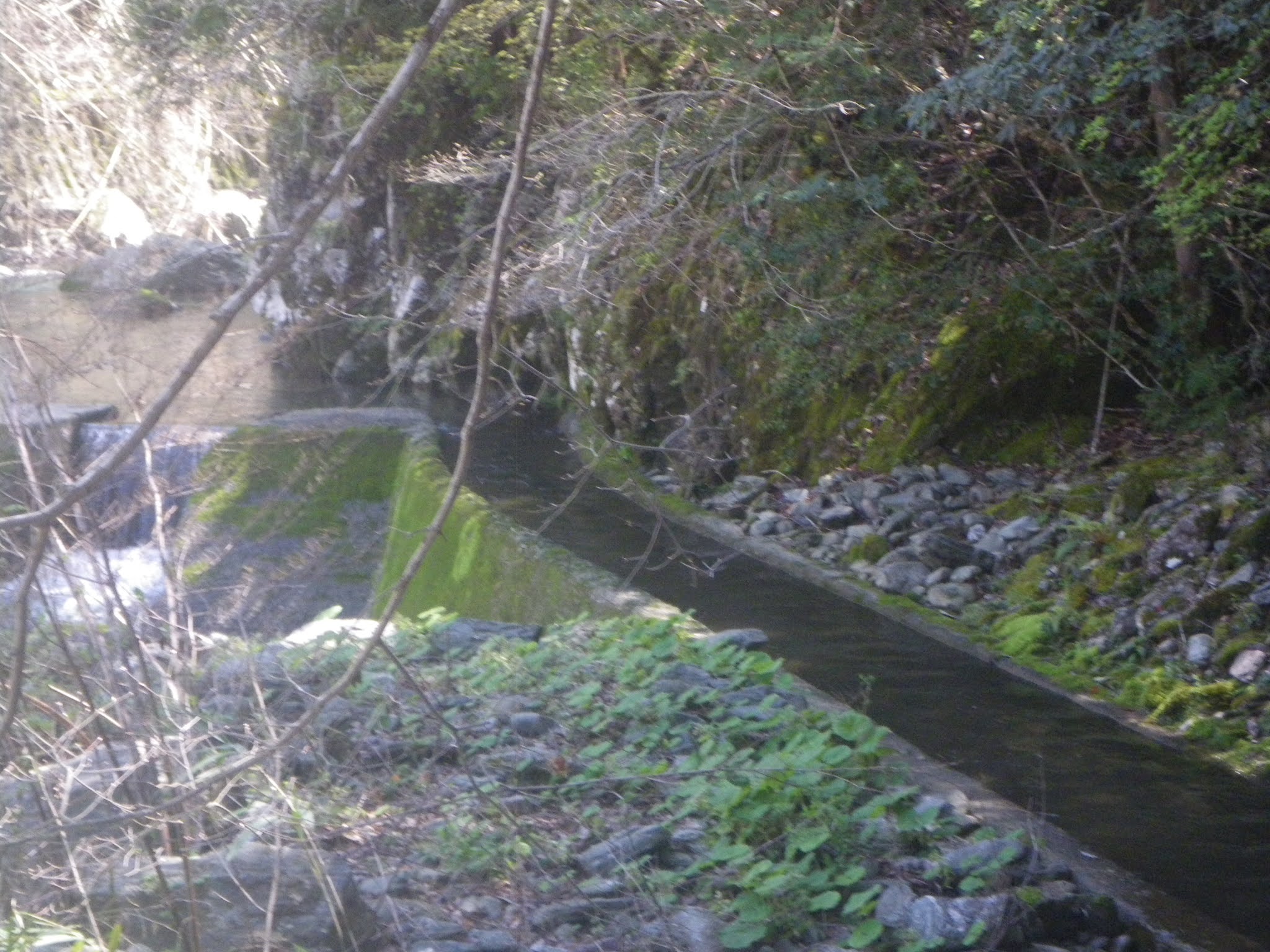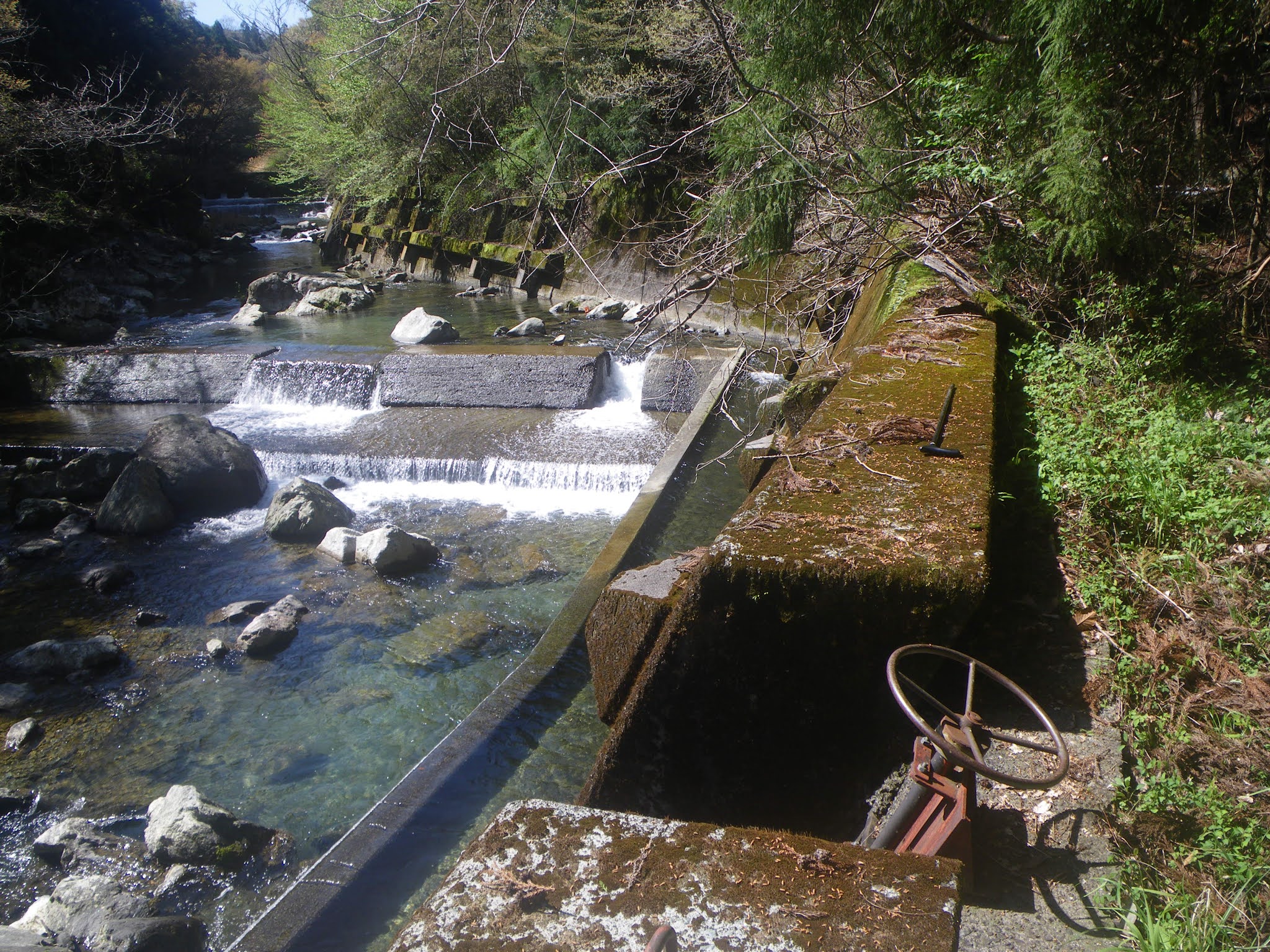 18分ほど歩き、おおよそその比高差が20mほどのギャップとなったところで最初の沢とクロスする。水路には簡易水門が設けられている。下は直ぐ川であり時に応じ水を川に放流するのだろう。