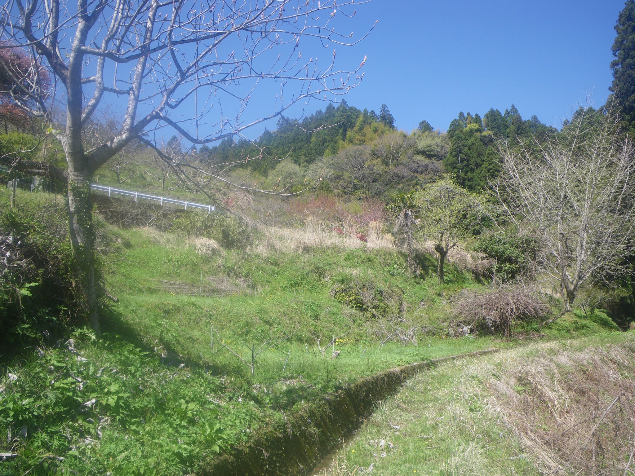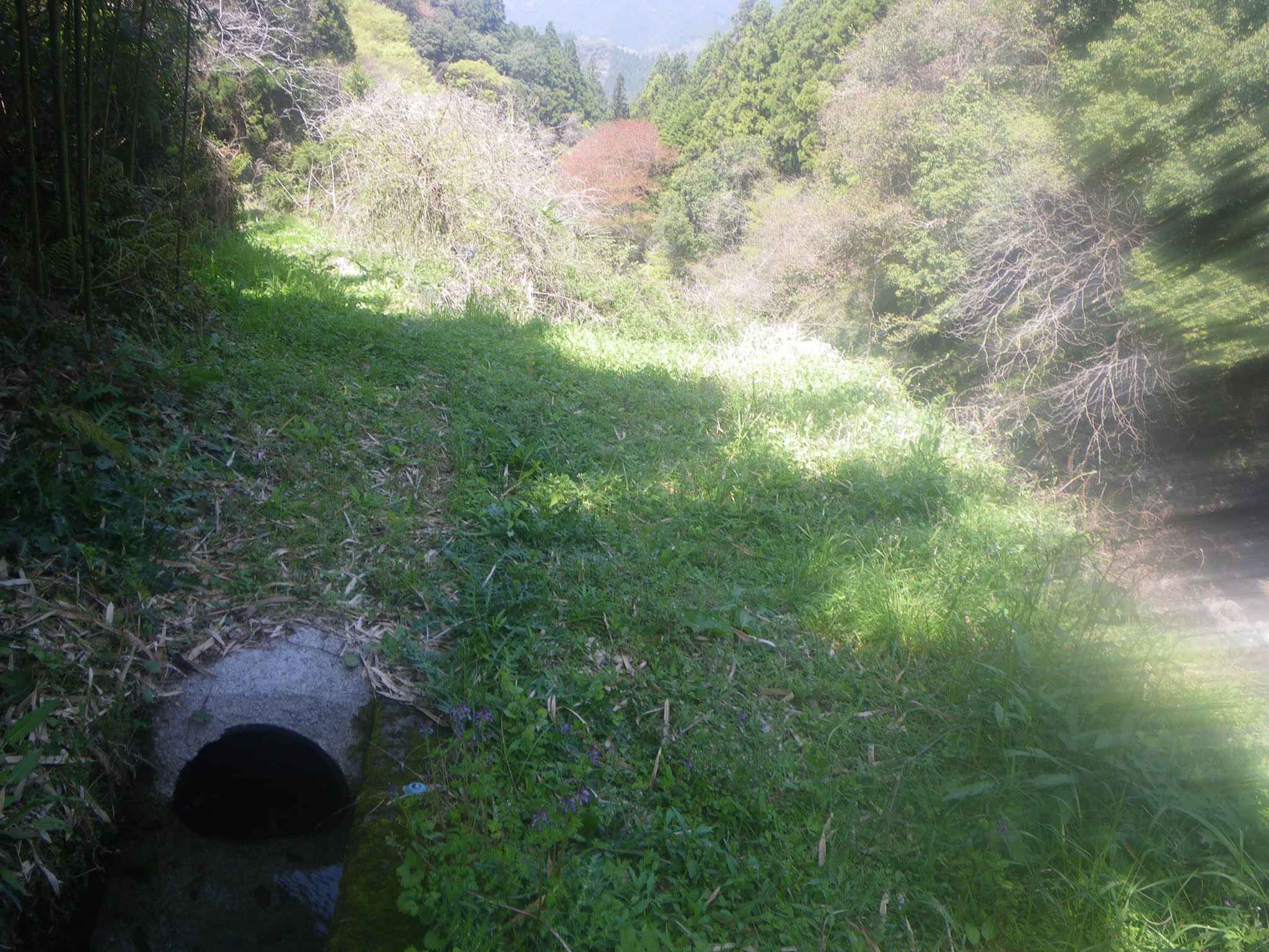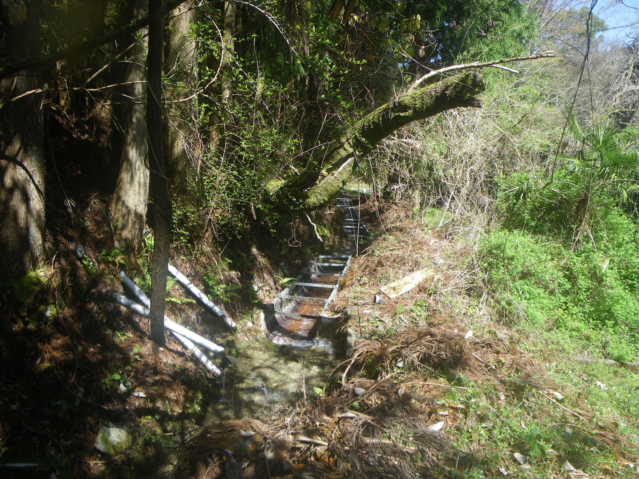水路の谷側にも柵が設けられていたが、それも直ぐに無くなり、竹林や杉林の中を10分ほど歩くと南に切れ込んだ沢に出合う。