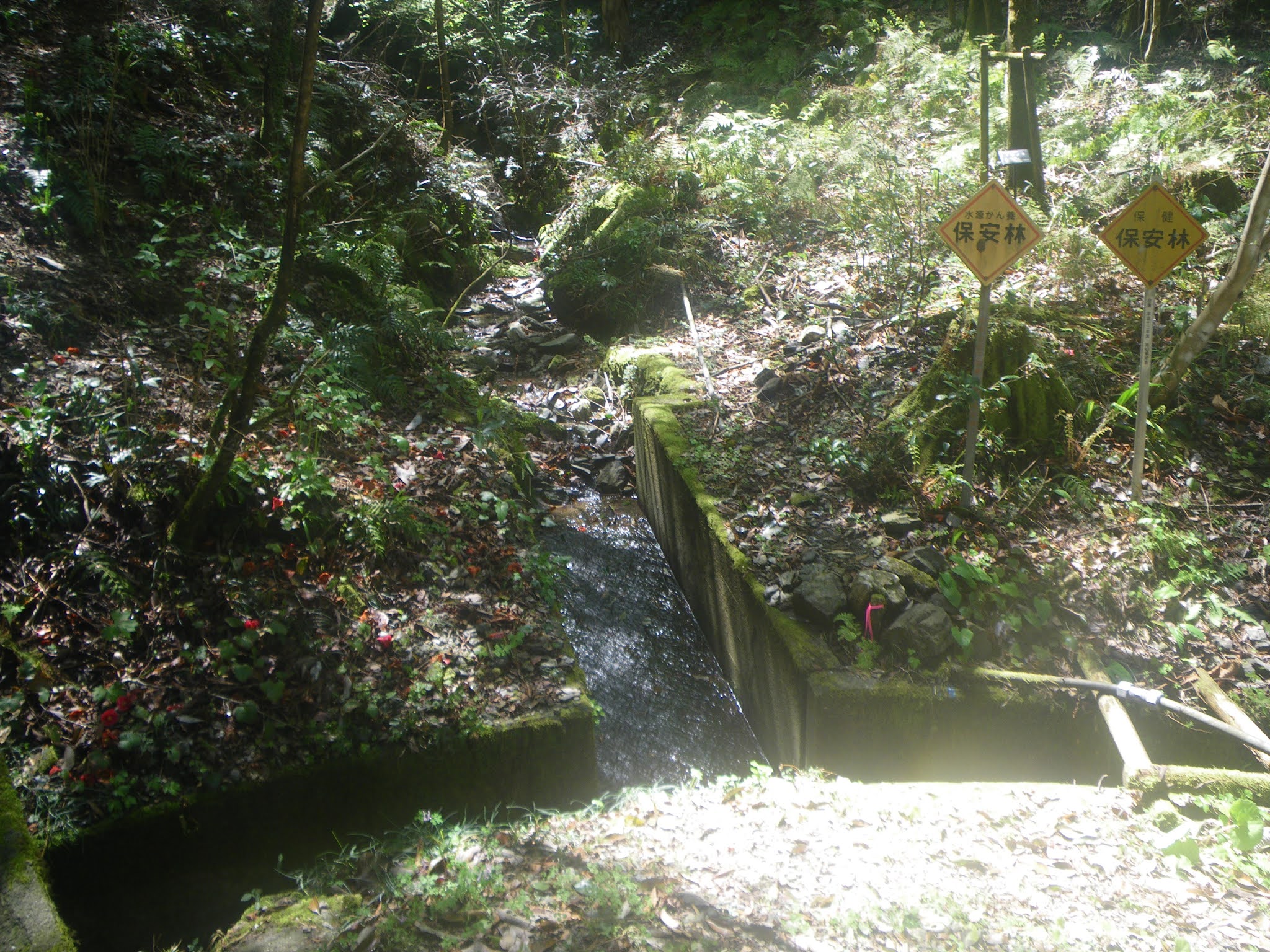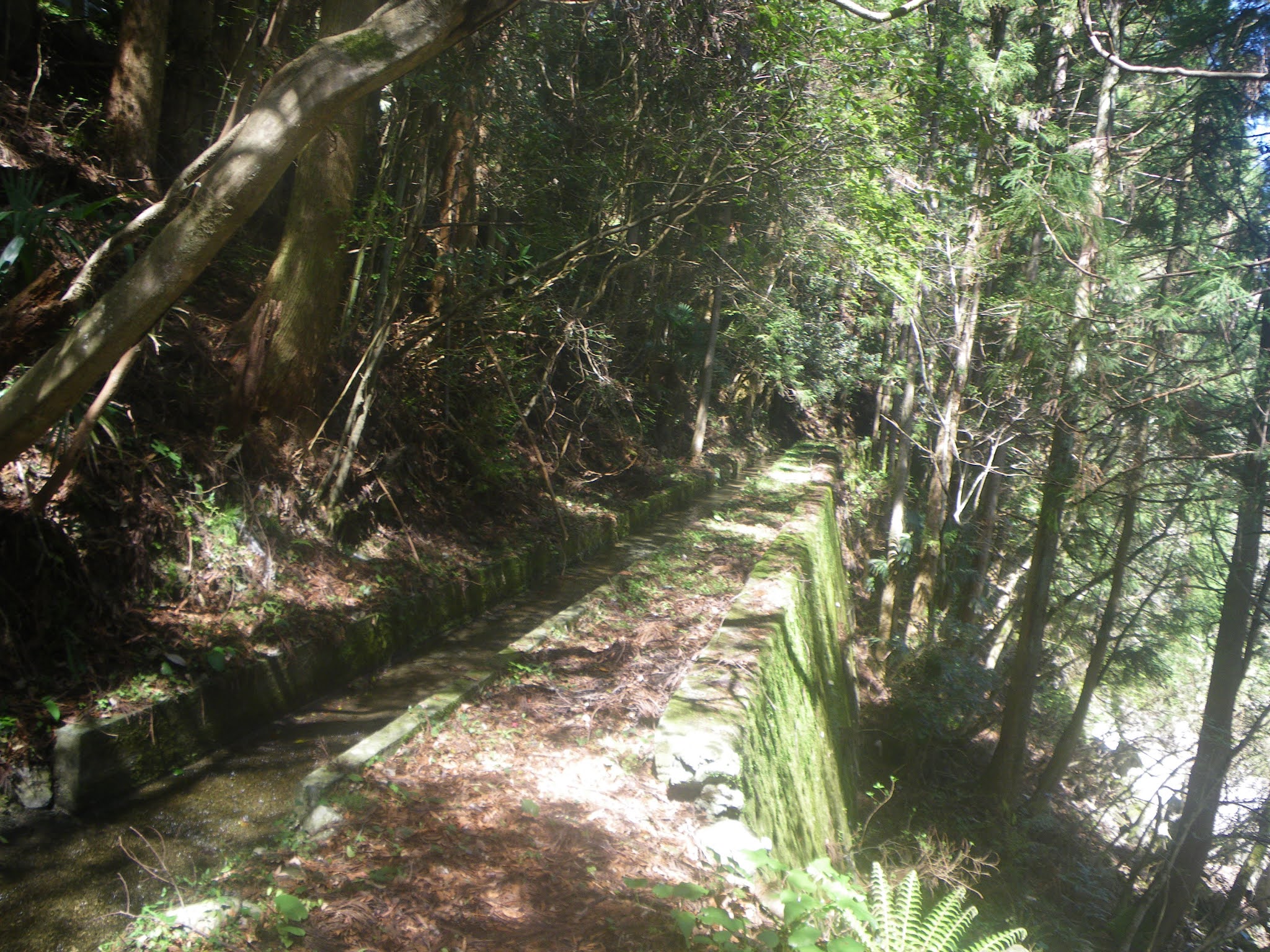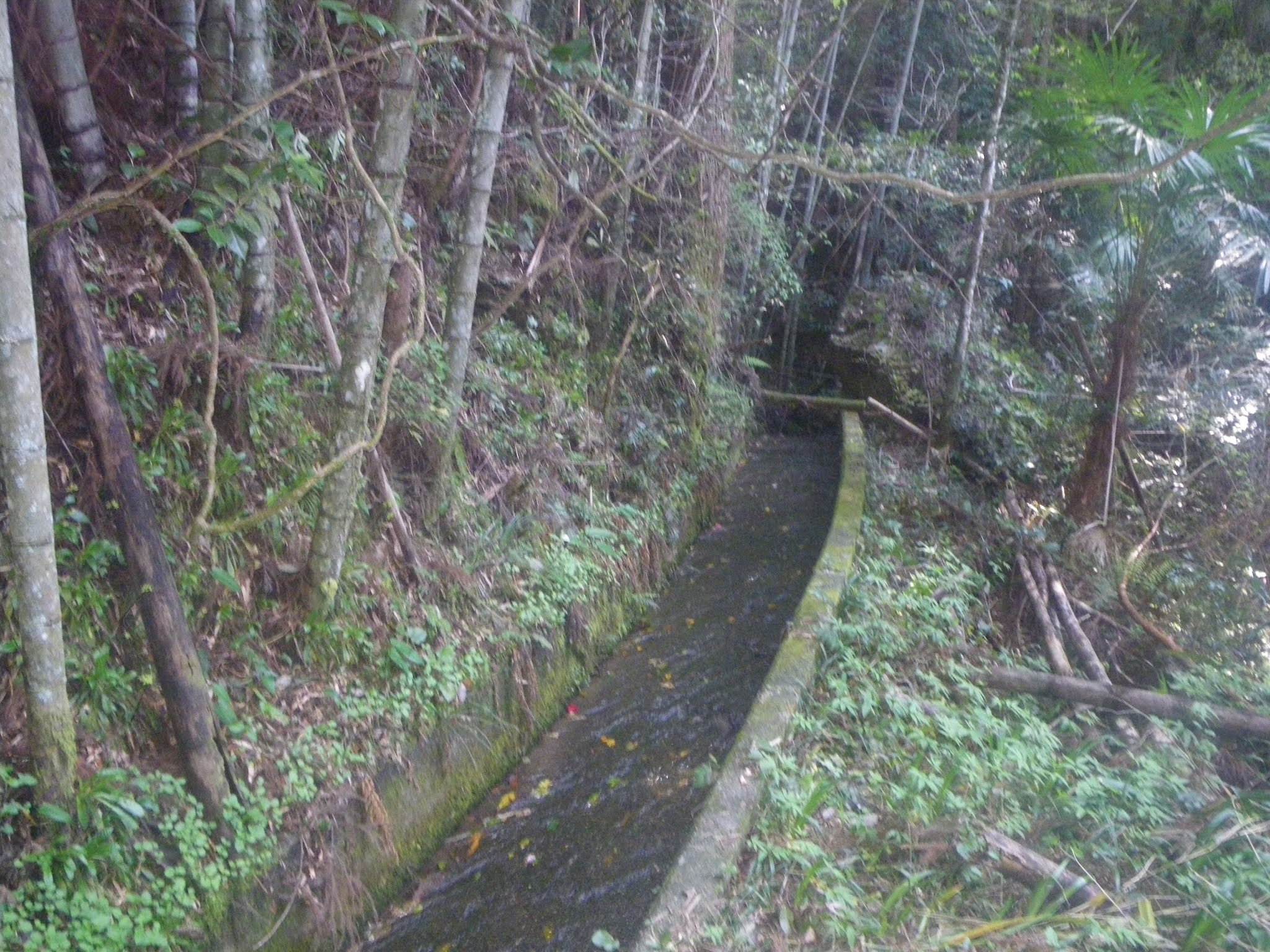 舗装された生活道から離れた水路は再び木々に覆われた山裾部の少し上を進むことになる。「上の坊」への道から9分ほど歩くと、南に切れ込んだ谷筋を渡る。