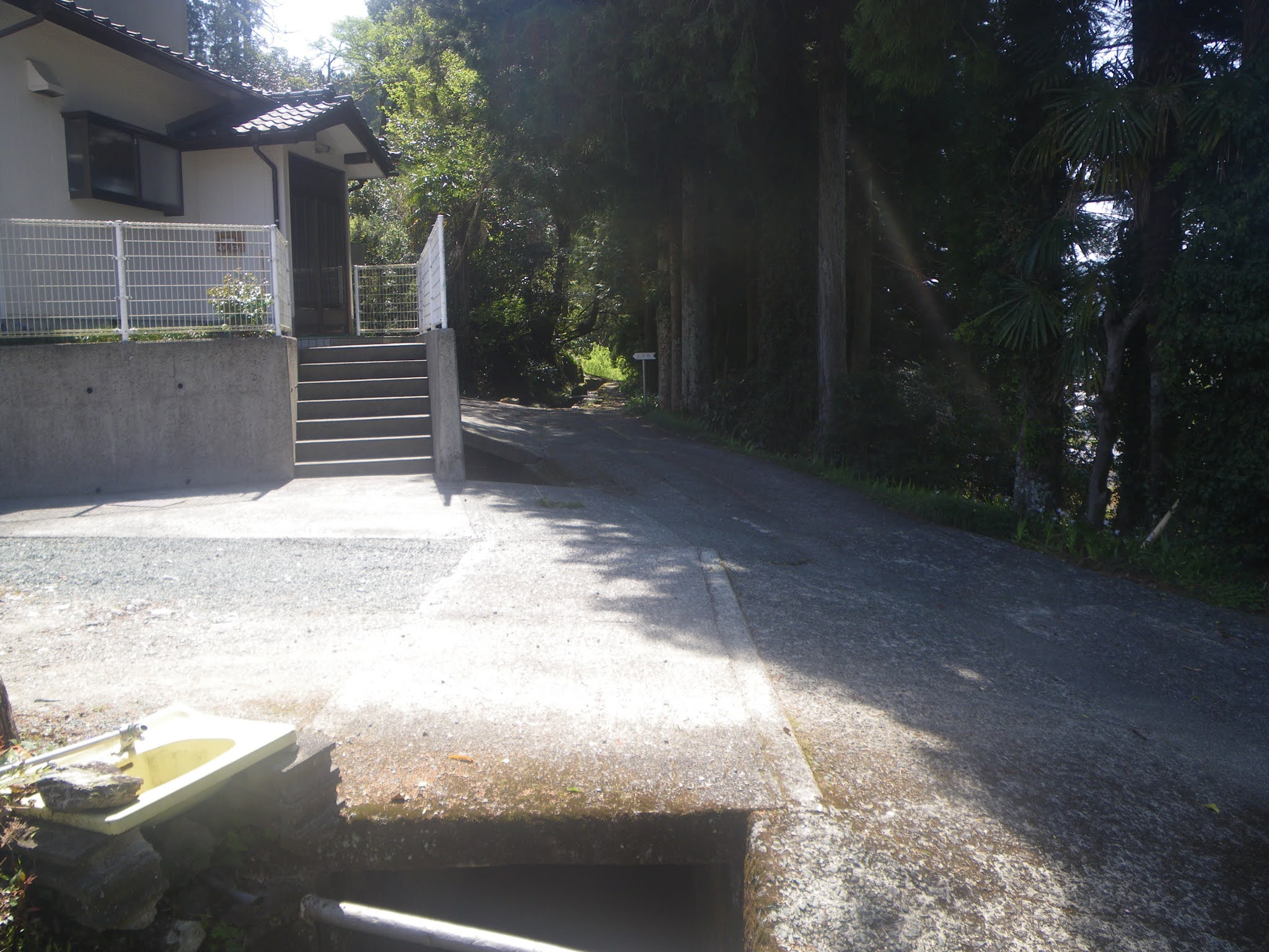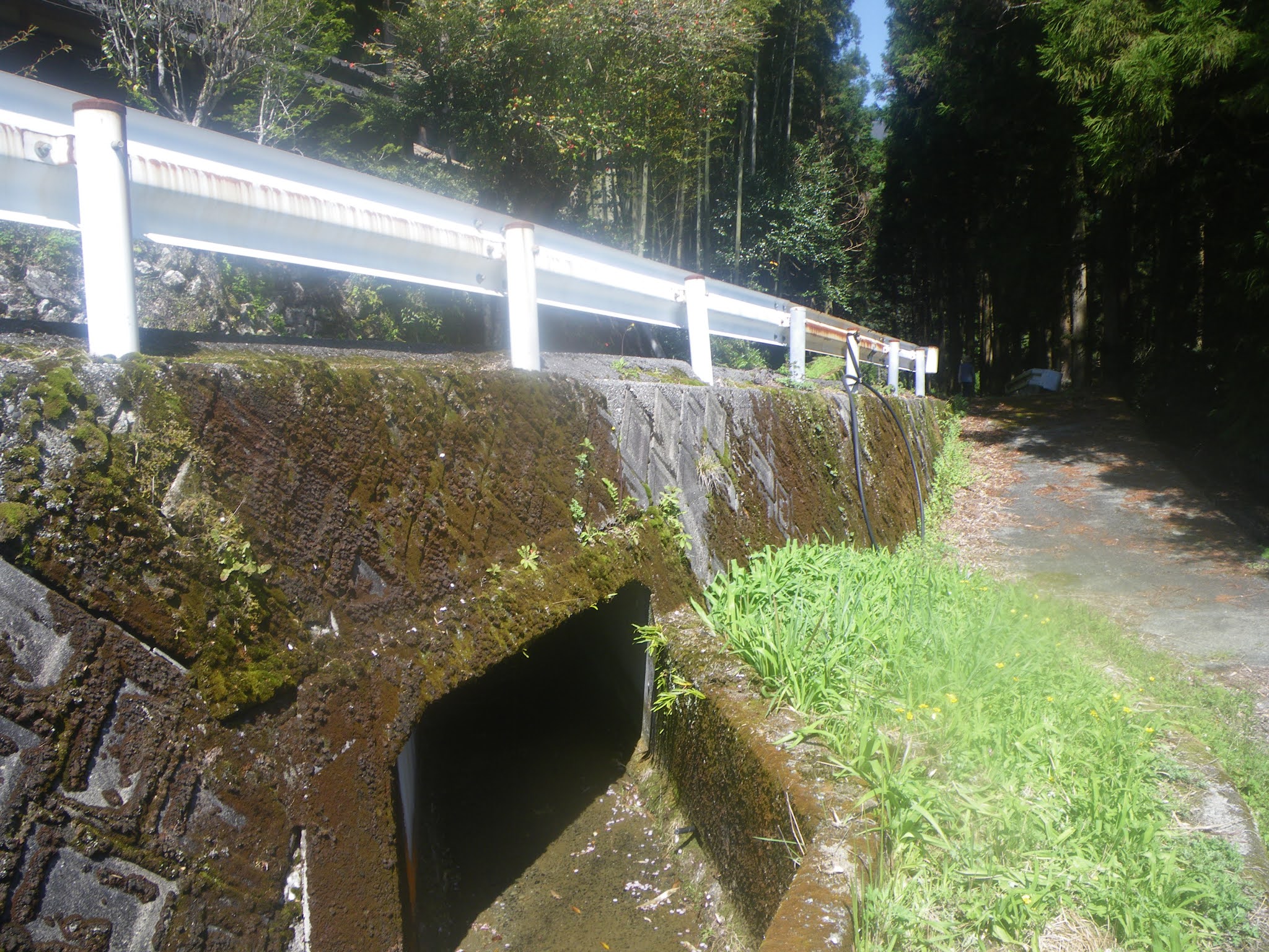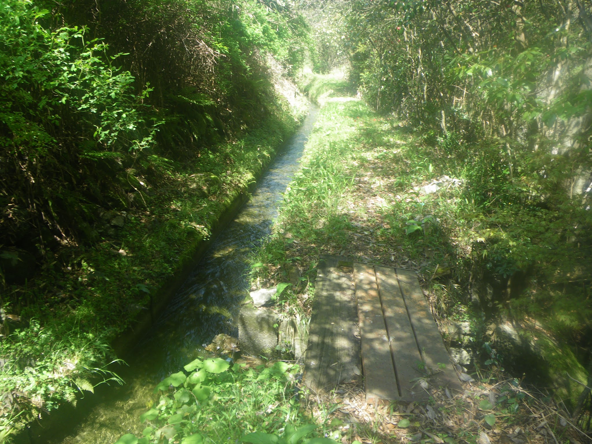 舗装された生活道から離れた水路は再び木々に覆われた山裾部の少し上を進むことになる。「上の坊」への道から9分ほど歩くと、南に切れ込んだ谷筋を渡る。