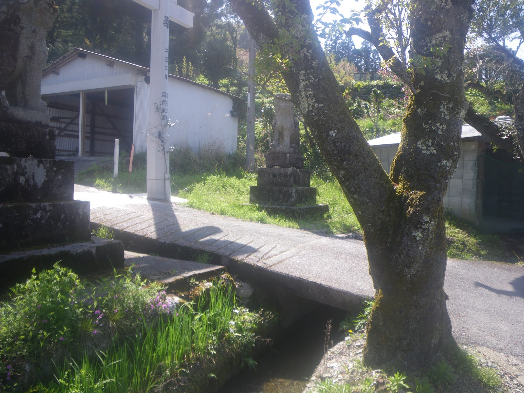 案内図の概略図を頼りに流路を探すと、ふたつの流れは本山町の山裾、少し高台に鎮座する十二所神社の参道を横切っていた。上井は神社の二の鳥居辺りで参道を東西にクロスし、下井は一の鳥居傍をクロスしていた。土佐北街道散歩で十二所神社の一の鳥居前を辿っており、知らず下井に沿って歩いていたわけである。