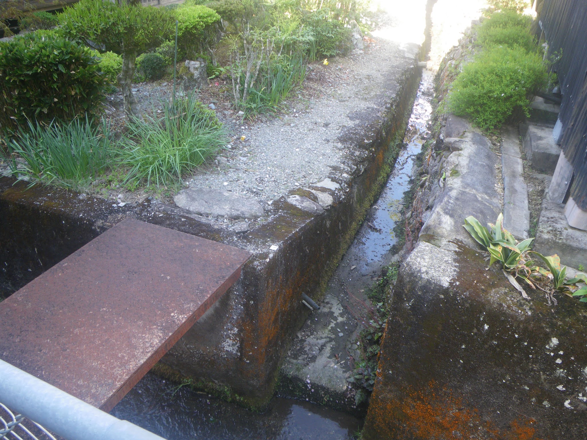 町並みの中を西進する水路は時に上に鉄網やコンクリートで蓋をされる。少し進むと鉄網の下、水路から下に分流する箇所がある。昔は一面の田圃であったのだろうが、は家並みが軒を連ねる。