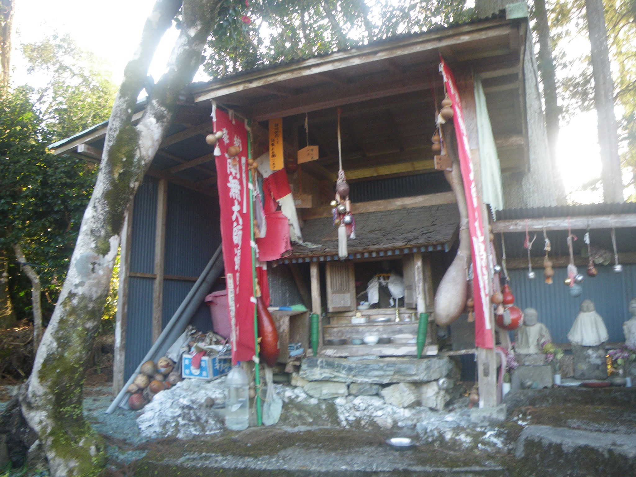 鳥居手前には地神さまらしき幾多の祠が並ぶ。どこかからか移されたのだろうか。 水路は二の鳥居傍をクロスし西に抜ける。