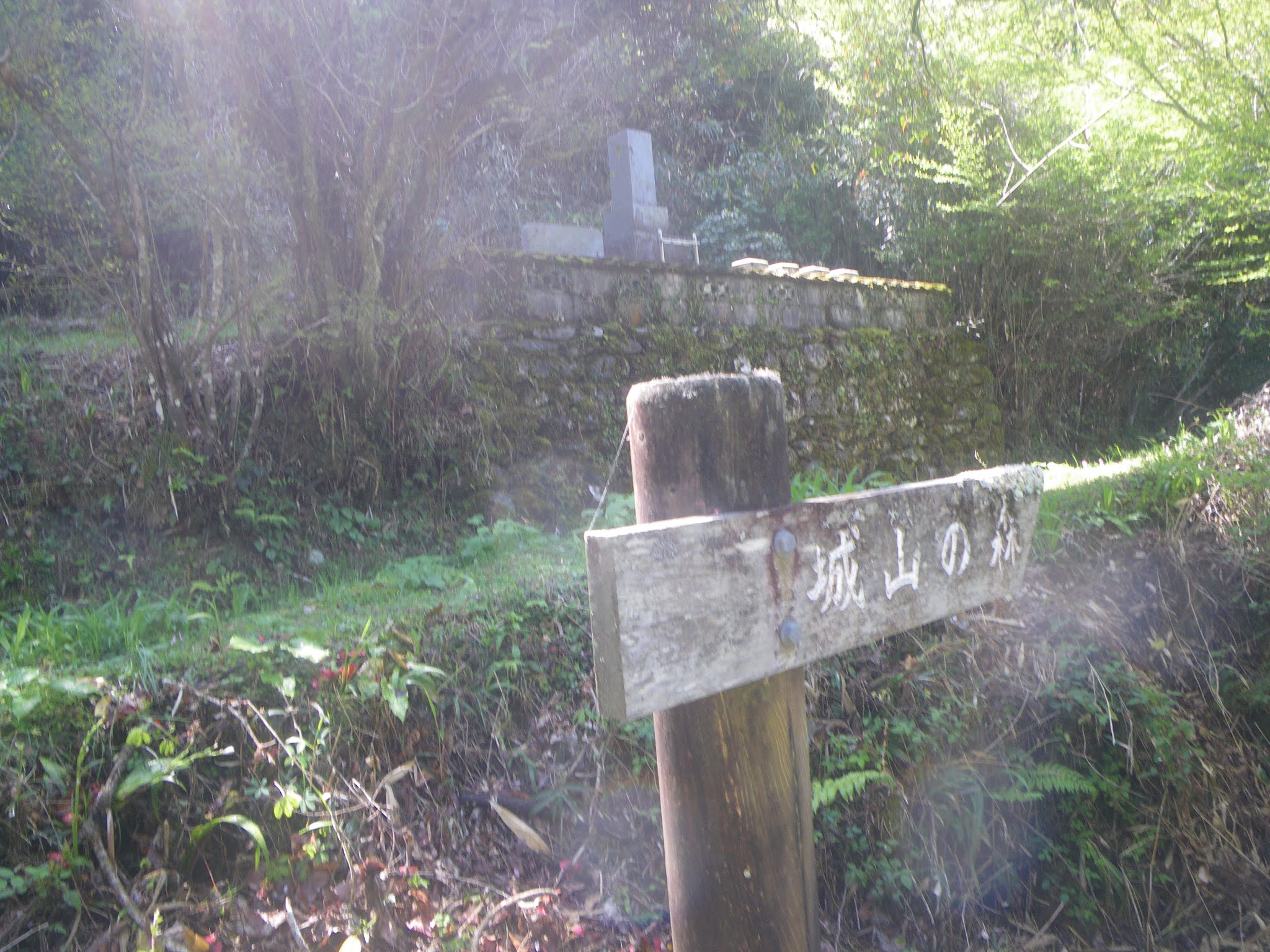 貯水槽から5分弱、「城山の森」と書かれた木の標識が立つ(標高298m)。標識は水路進行方向を指す。地図を見ると水路の20mほど下を走る土佐北街道の道筋から標識まで実線が記される。町からこの道筋を上井筋まで上り、水路に沿って先に進み十二所神社のあたりから城山へと上るようである。