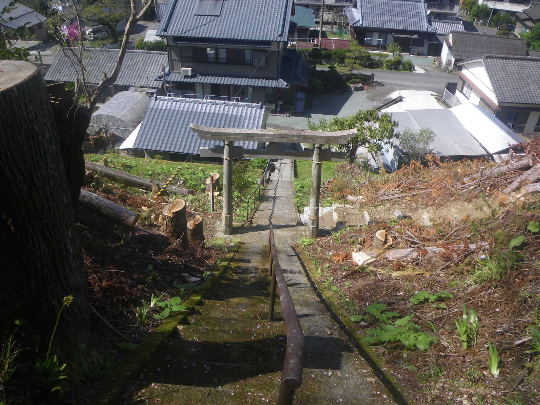 八郎谷から先に進むと水路の周囲の木々が伐採されている。6分くらい歩くと水路は天神参道の石段をクロスする。水路は木々が切り開かれた参道の石段下に見える町並みからおおよそ10mほど高いところを流れているようだ。標高272m。