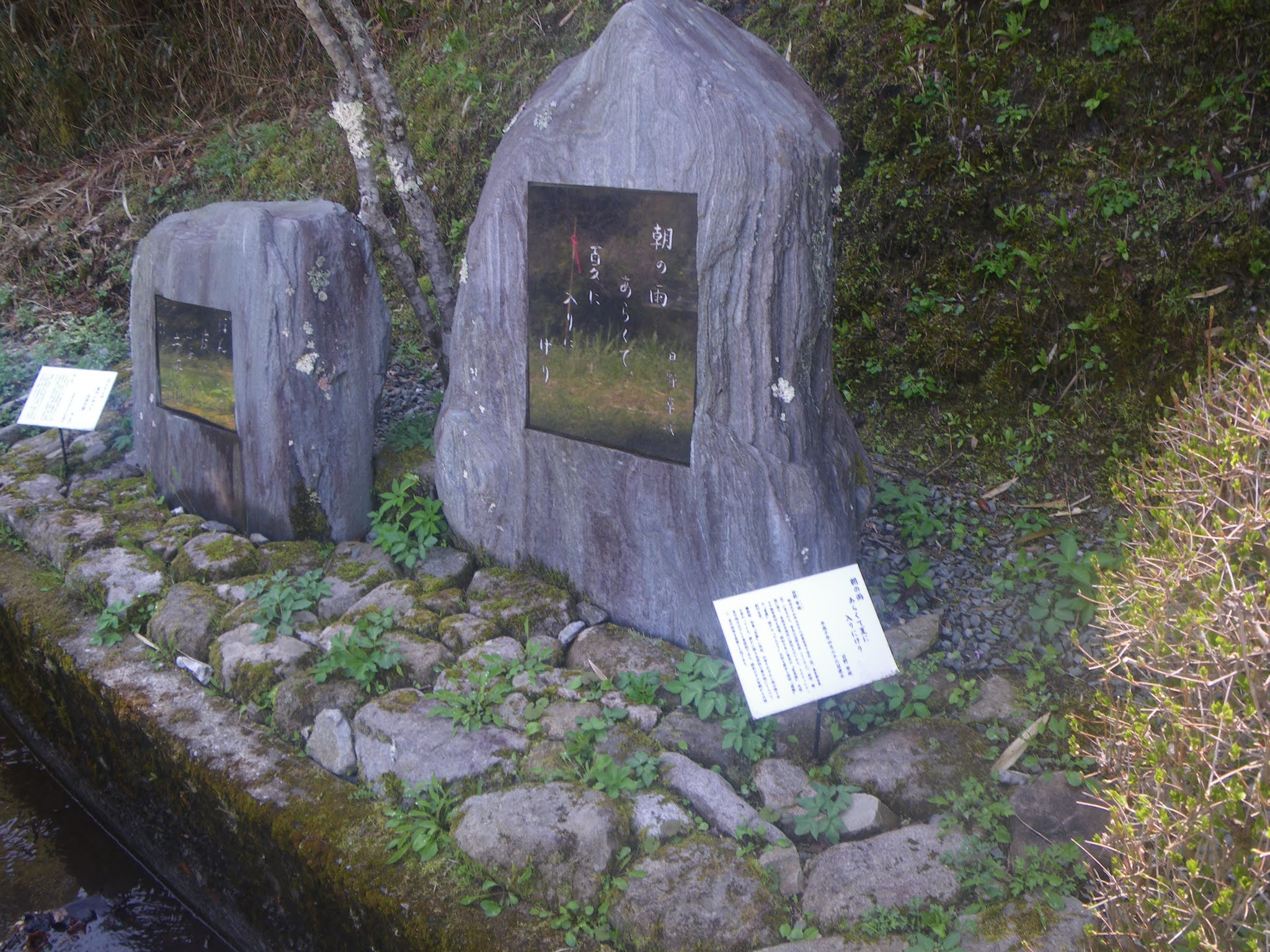 ほどなく水路傍に2基の歌碑。「秋の暮れ 山脈いづこへか帰る 山口誓子」「長き日の なお永かれと野に遊ぶ 山口渡津女」と刻まれる。平成9年(1997)建立。標高266m。