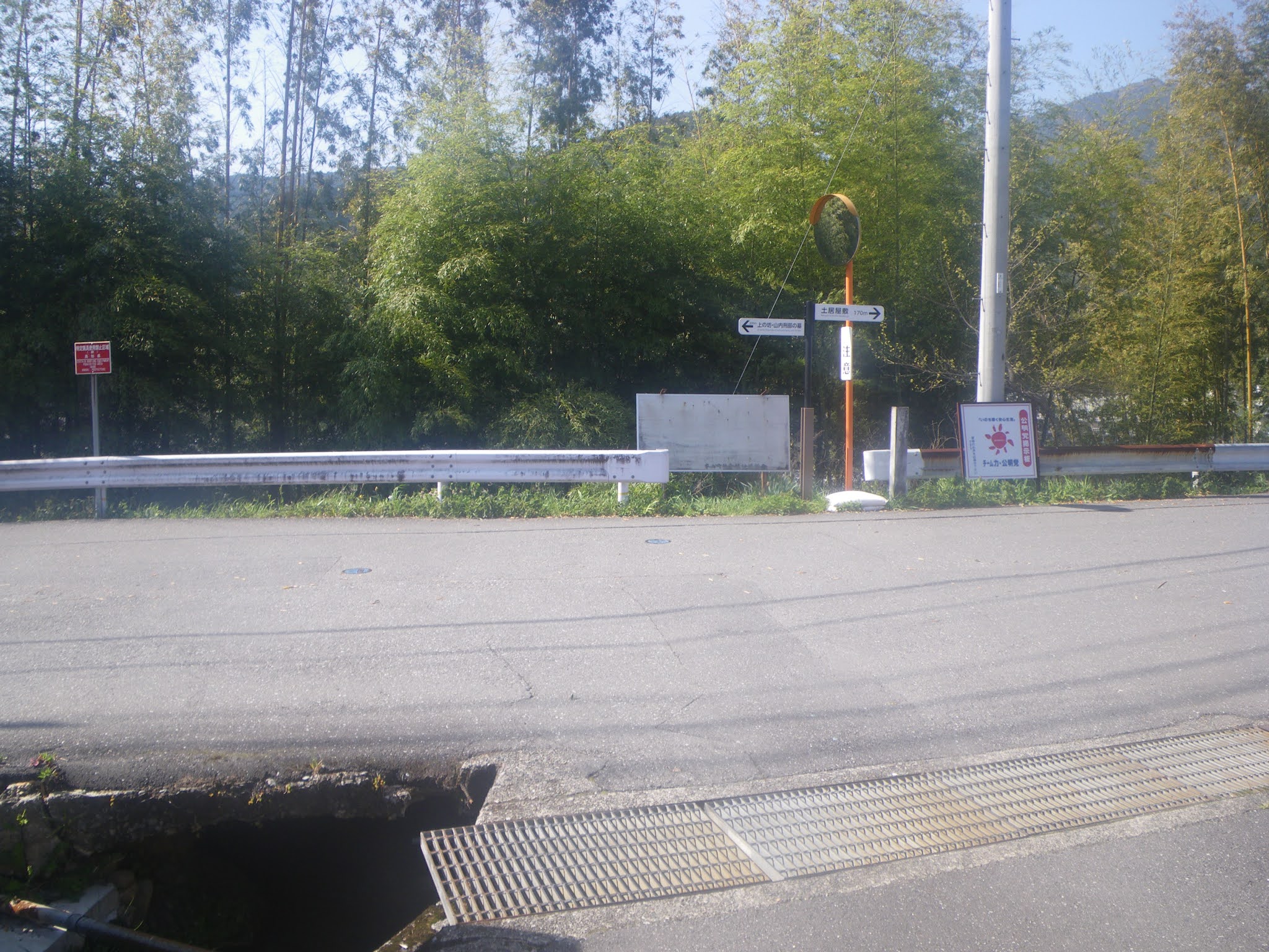 ほどなく水路は崖の手前で南に道路に沿って流路を変える。流路を変える地点の道の反対側に「←上の坊・山内刑部の墓」「土居屋敷 170m→」の標識が立つ。