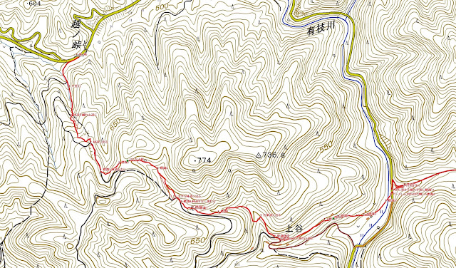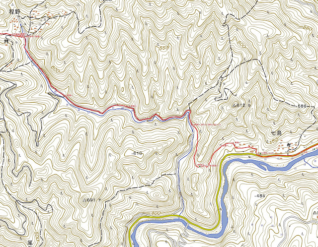 ダウンロードしたトラックログをもとに七鳥までのルートをチェック。越ノ峠から山入りした街道は南に山稜を150mほど上げ、標高700mの「はじかみ峠」に進み、そこから東に270mほど高度を下げて仁淀川水系久万川支流有枝川筋に下り、そこからに西に2キロ、高度を250mほど上げ「色の峠(標高650m)」に達する。