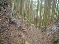 道を進むと林道はヘアピン状に大きく右に曲がる。土佐街道はこのヘアピンカーブの突端部で林道から逸れ枝尾根の間へと直進する。久万高原遊山会のデータではこの地に「土佐街道」の標識が立つとのことだが、見落としたのか無くなったのか、ともあれ標識は見つけることができなかった。