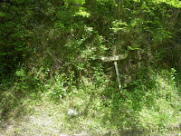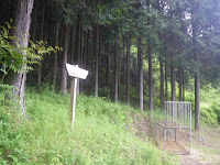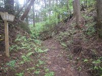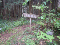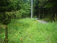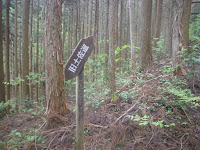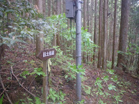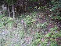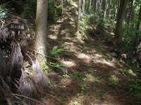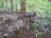 林道は先ほど分かれたヘアピン部から続いている。林道を10分ほど歩くと道の左手に「土佐街道」の標識(以下便宜上「土佐街道」の標識に連番を振る。ここは標識1)。アプローチ部はちょっとわかりにくいが久万高原遊山会のトラックログによれば標識1から林道から逸れるようである。トラックログをGPSギアにプロットしておいたため、草に覆われた中へと足を踏み入れたが、そうでなければ林道をそのまま進んでいたように思う。トラックログをダウンロードできるようにしていただいた配慮に感謝。