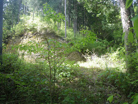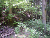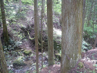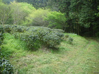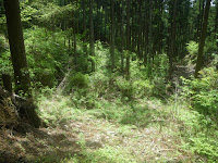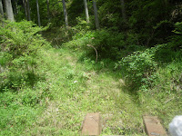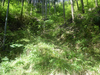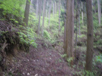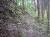 小さな枝尾根の間には、それらしき踏み跡もみつけることができす、取敢えず藪の中に足を踏みいれる。先に進むが藪が激しい。勘弁してほしいと左右を見ると、右手に踏み跡らしき筋が見えた。藪を右に廻り込むと結構踏み込まれた土径に出た。 念のため道を林道まで下りアプローチ口を確認。アプローチ口はヘアピン突端部の東端、時節から入り口も土径も草に覆われりにくいが、よく見れば他とはことなる踏み込まれた風の土径がある。アプロ―チはここから入ること。