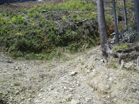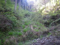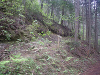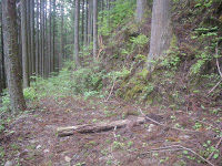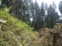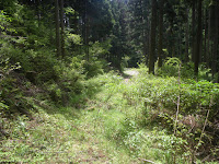 道を戻ると作業道に出た箇所に繋がった。標識から先も伐採作業道に出ることなく、作業道を右手に見ながら草に覆われた土径を下れば大きな林道に出る。久万高原雄山会の資料では作業道に出るのが土佐街道のようにも思えるのだが、この箇所ははっきりしない。