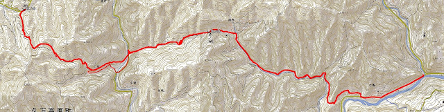 で当日、実際には7時間ほどかかってしまった。トラックログはあったのだが、藪が激しく、また標識を見落としたのか無くなってしまったのか道に迷い、それでもその後見つけた標識を手掛かりに、久万高原遊山会のトラックログを全部つなげようと道迷い地点まで引き返すなどしたため結構時間がかかったのかと思う。 越ノ峠を午前9時に出発し、七鳥に下り岩屋寺口バス停についたのが午後4時過ぎ。膝の痛みに倒れ込む。あまりに身も世もない(語用が間違ってる?)姿であったのか、パトロール中のパトカーのお巡りさんが心配してか、声をかけられてしまった。