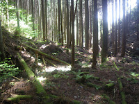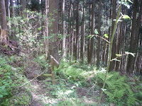 再び小さな沢筋(午前11時21分)を越えたあたりから道は倒れた木々、落ちた枝葉で覆われはっきりしない。取敢えず開けた方向に向かって杉林を進む。