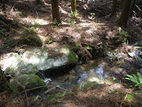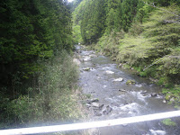ガードレールが切れる「旧土佐道」の標識(A標識4)の立つところから県道209号に出る。すぐ先に有枝川に注ぐ支流というか沢がある。