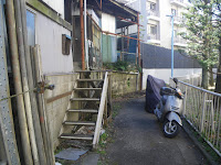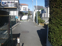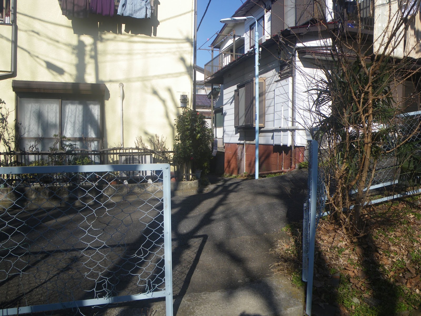 中田橋のすぐ先に善福寺川に注ぐ排水口とその排水口へと北から通る細路がある。道はコンクリート舗装されており、その先に車止めが見えるが、水路跡かどうか不明である。もう少し上流まで進んでみる。