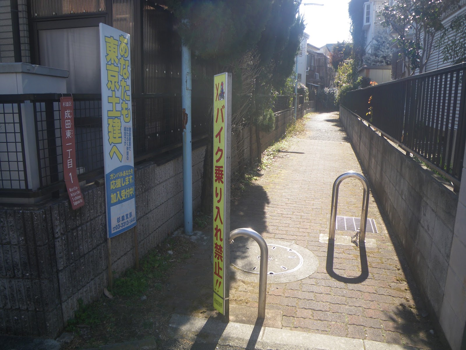 神明橋を越え、左岸を少し進むと中央にポールが立った細路がある。なんとなく水路跡の雰囲気。「今昔マップ 首都 1944‐1954」に描かれる水路らしきラインより少し手前ではあるが、とりあえず北に向かう。