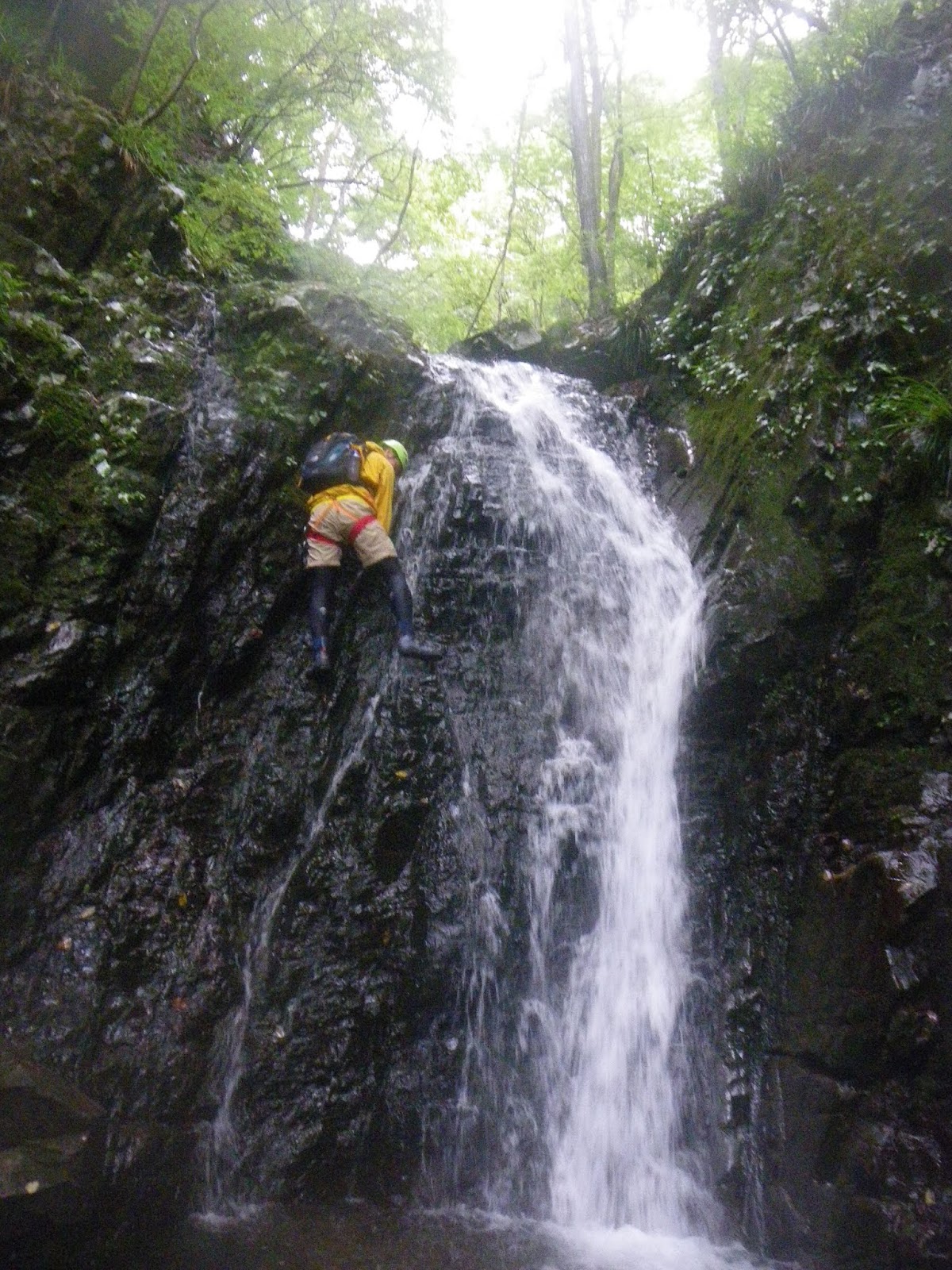ついで本日の最終ポイントとした5mの滝。滝の左手の岩場は急ではあるが、適当なホールドがあり、岩場を這い上がることができた。S嬢には安全確保のロープを結び、岩場を上ってもらった。
