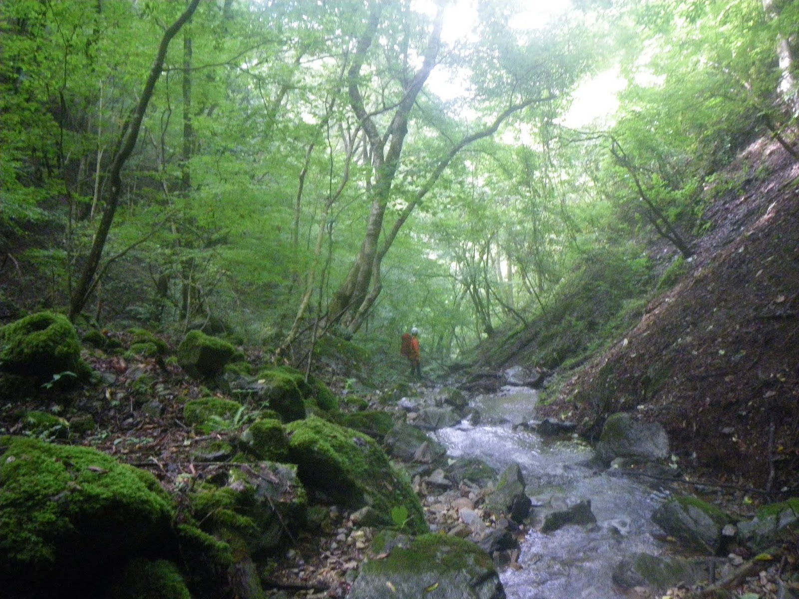 ●今回は懸垂下降の練習ということで、尾根に這い上がることなく奥の二俣手前の5m滝をピストンで上り・下りした。