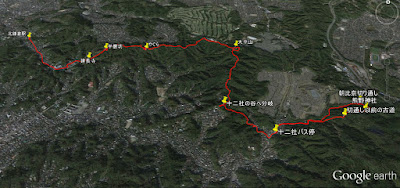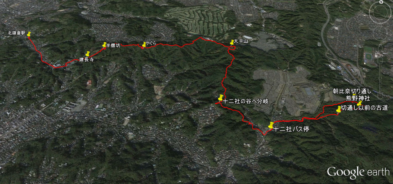本日のルート;北鎌倉駅>建長寺>半僧坊大権現>天園ハイキングコース>覚園寺分岐>大平山の頂>横浜市最高地点>天園休憩所>瑞泉寺分岐>沢を下る十二社へのショートカットルート>十二社バス停>大刀洗川に沿って進む>朝比(夷)奈切通し>磨崖仏>熊野神社>尾根筋を三郎の滝に戻る>十二社バス停