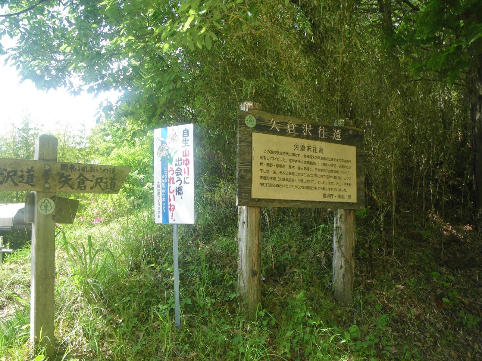 峠にあった矢倉沢往還の案内には「矢倉沢往還; 近世の交通路は五街道を中心に、本街道の脇にある往還が陸上交通の要として整備されていました。矢倉沢往還は東海道の脇往還として発達し、江戸赤坂御門から厚木・伊勢原・善波峠・曾屋(十日市場)・千村・松田惣領・関本などを抜け、足柄峠を超え駿河沼津宿まで延びていました。大山への参詣路として利用されていたため、大山街道と呼ぶ所もあります。現在の246号線は、概ねこの矢倉往還に沿って通じています。また、当時秦野の経済活動の中心をなしていた十日市場で開かれる市において、矢倉沢往還は物資運搬に大きな役割を果たしていました(秦野市)」とあった。
