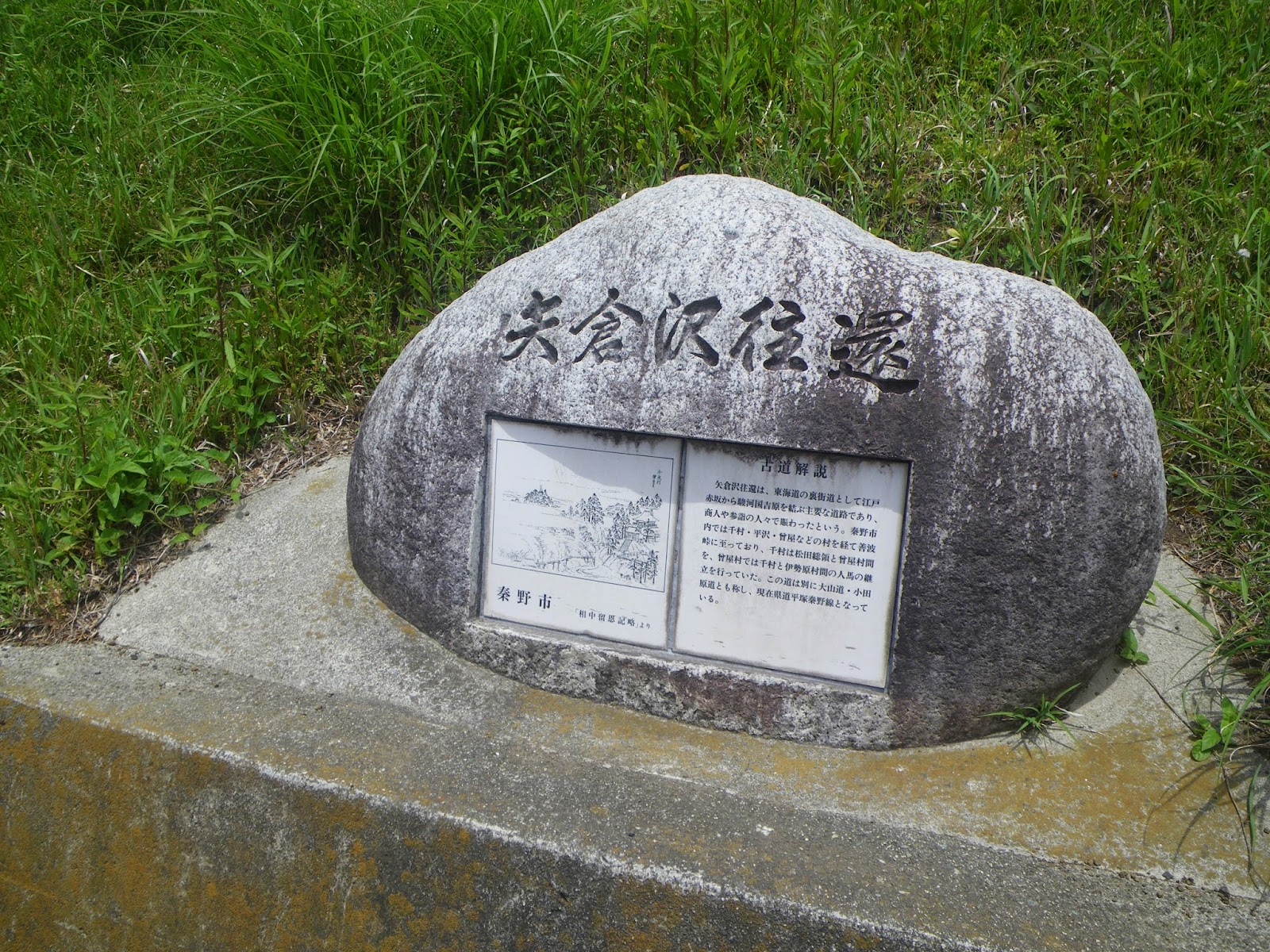 その清水町を越えた先にある南中学校南の道路脇に「矢倉沢往還」の案内。 「矢倉沢往還 古道解説 矢倉沢往還は、東海道の裏街道として江戸赤坂から駿河国吉原を結ぶ主要な道路であり、商人や参詣の人々で賑わったという。秦野市内では千村・平沢・曽屋などの村を経て善波峠に至っており、千村は松田惣領と曽屋村間を、曽屋村では千村と伊勢原間の人馬の継ぎ立てを行っていた。この道は別に大山道・小田原道とも称し、現在県道平塚秦野線となっている」とあった。