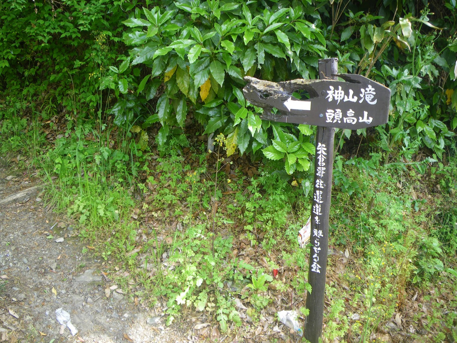 お不動様の近くに少々荒れた小屋があり,[西の玄関沓掛]の標題とともに,(山に向かった矢印 に[茶屋まで約1.5キロ 渋澤駅まで約3キロ],逆方向にには[蛇塚踏切約600m 河内橋 神山滝約1.2キロ 頭高山へ 約2.5キロ 渋澤駅へ 約5.5キロ]と書かれた木標がある。それとともに「お帰りなさい お不動さん ふるさとへ30年ぶり」といった新聞記事が貼られていた。