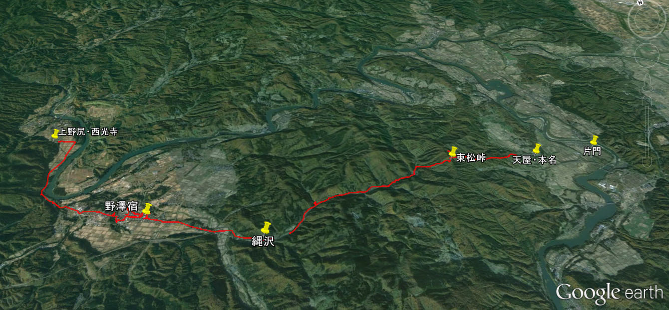 束松峠>子束松>切通し>束松洞門>天屋一里塚>地辷(地滑り)点>旧街道石畳跡>旧越後路木標>「旧道入口」木標>天屋の束松>峠の六地蔵>松原屋>津川屋>阿弥陀堂>束松事件跡>そば畑>諏訪神社>片門集落>片門の渡し跡>肝煎・渡辺家>片門の薬師堂・薬師如来>長龍寺