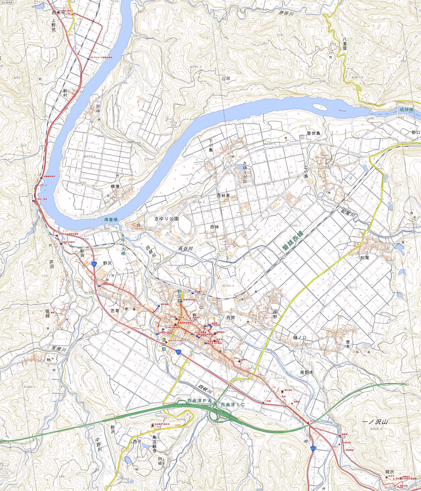 パラグラフのつながりがよくわからなかったのだが、地図を見ると、道の南、磐越道との間のソバ畑の区画が如何にも人工的に「カクカク」と削られている。堆積物を掘り返し、その後をソバ畑としたのだろうか。