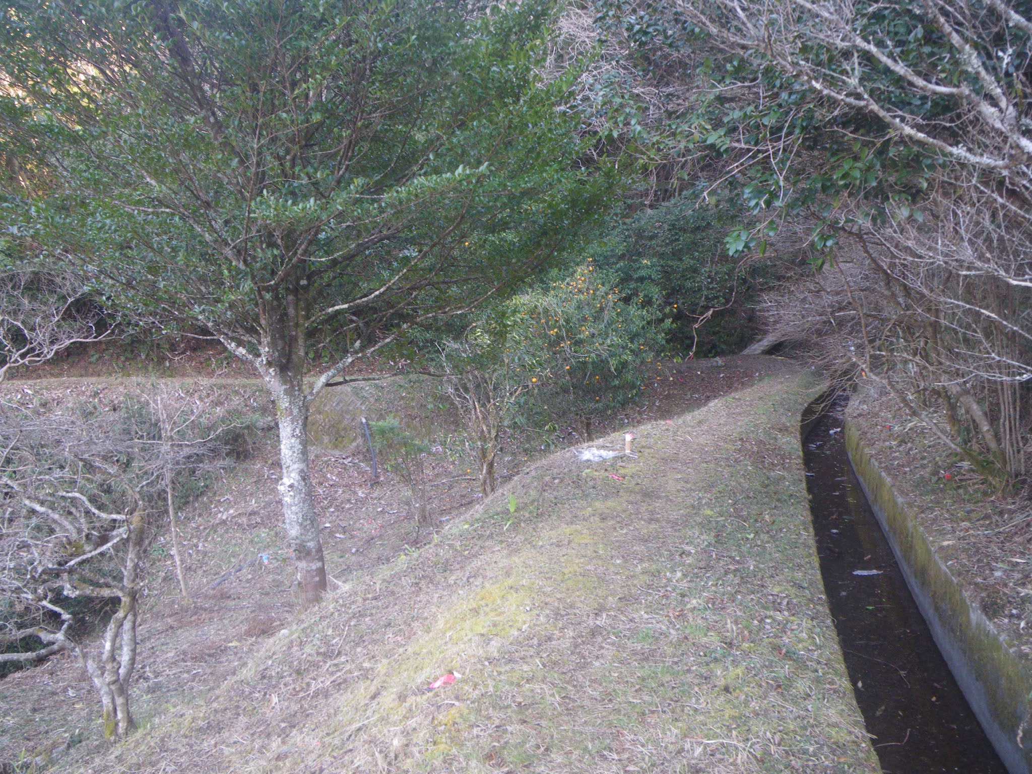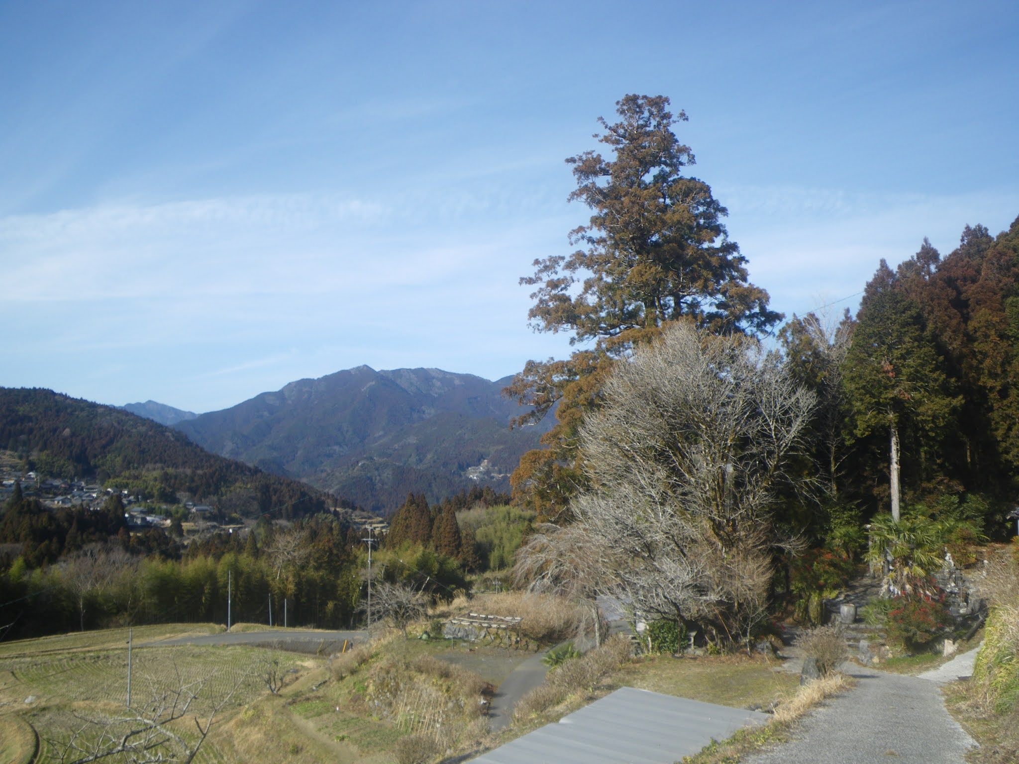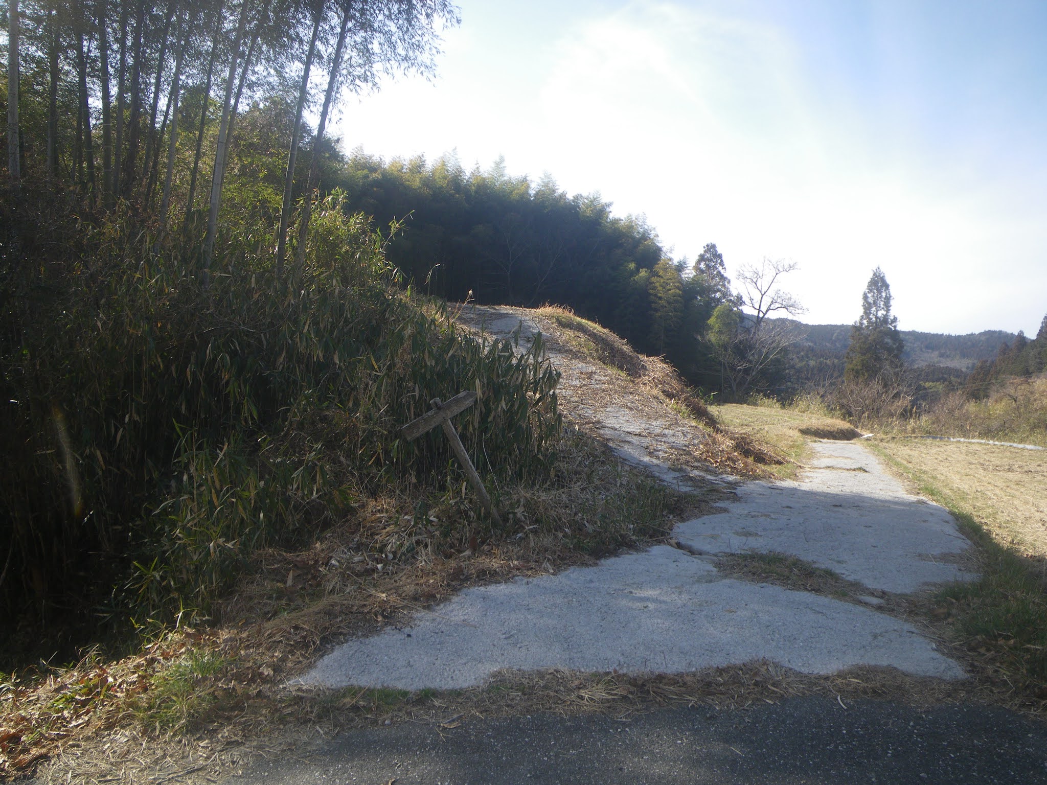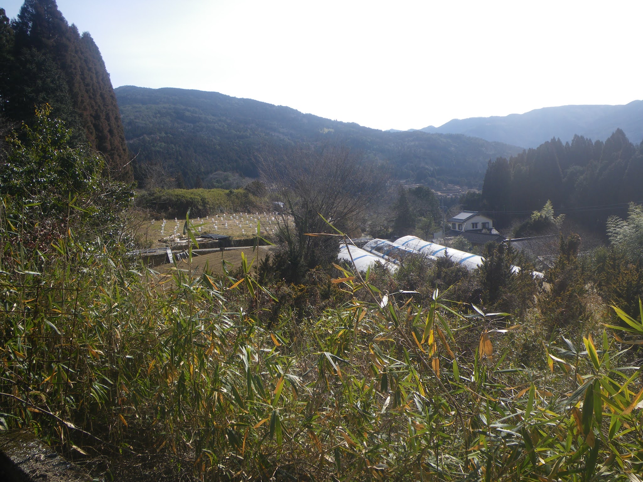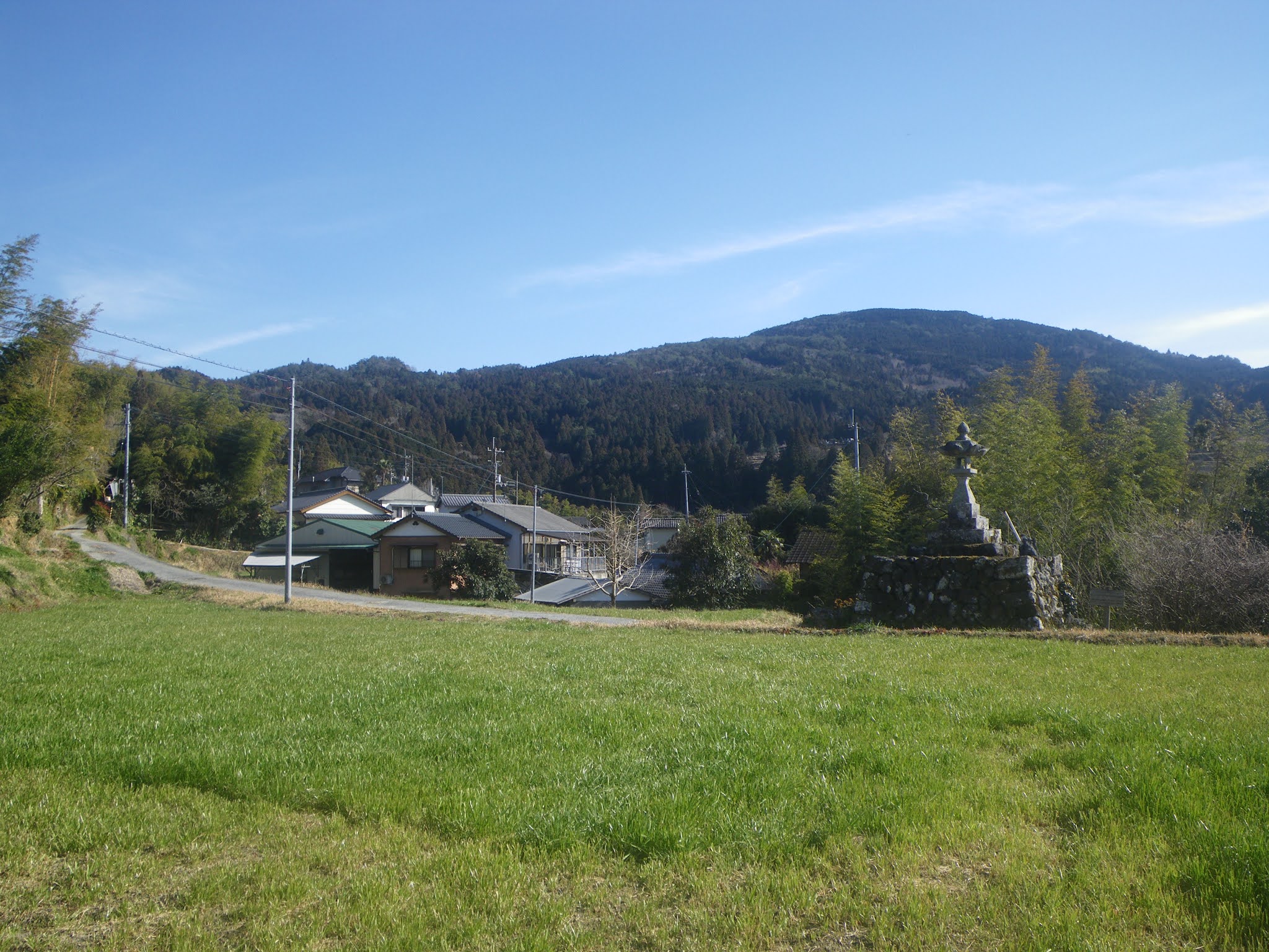 燈明台と道を隔てた反対側に広い平坦地がある。上述書籍には街道筋に「大休場」があり、参勤交代の隊列を整え、また茶店や宿屋も数軒建っていたとの記事がある。この平坦地は休耕田のようにも思えるが、国見山から下る途次、大休場らしき場所を見ることはなかった。「大休場」何処にあるのだろう?平坦地から国見山方面を借景に写真を一枚。なかなか、いい。